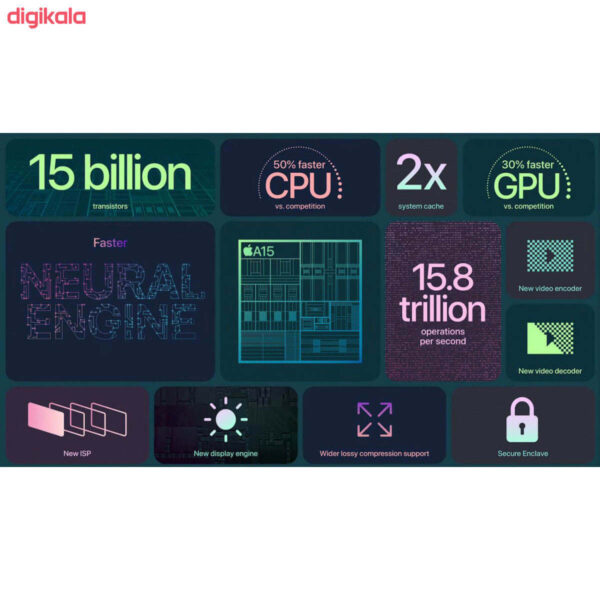 باید قبول کنیم که تا به امروز، پردازندههای قدرتمند گوشیهای هوشمند اپل در کنار سیستم عامل بینظیر iOS توانسته اند عملکرد بسیار شگفتانگیزی را به نمایش بگذارند. این بار هم آیفون 13 مینی همانند برادران بزرگترش، یعنی آیفون 13 پرو وآیفون 13 پرو مکس، به قدرتمندترین پردازنده این شرکت یعنیُ A15 بایونیک مجهز شده است. پردازنده ای با معماری 5 نانومتری و متشکل از 6 هسته (2 هسته قدرتمندتر بههمراه 4 هسته با کارایی معمولی و صرفه انرژی کمتر). برای GPU یا همان پردازنده گرافیکی هم، پردازنده اختصاصی 4 هستهای در نظر گرفته شده است.